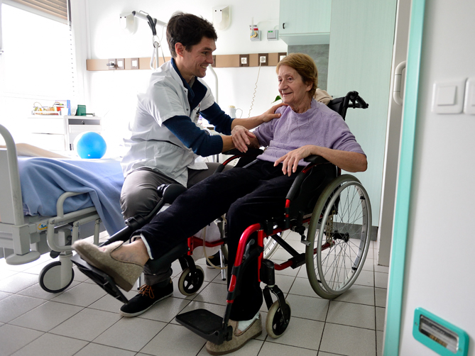 Psychomotricien à l'hôpital gériatrique Pierre Garraud de Lyon, Bastien intervient sur prescription médicale auprès de patients âgés, fragilisés après une chute ou une opération invalidante. « Souvent, ils ont perdu leur schéma-moteur et ne parviennent plus à se mettre debout, avec une tendance à se tenir en arrière à cause de l'angoisse de la chute. » Pour les réconcilier avec leur corps, le thérapeute propose aux patients des séances de rééducation motrice en prenant en compte leur état psychique. « Je ne peux plus marcher, qu'est-ce je deviens ? Cela renvoie à qui je suis, relève Bastien. Les personnes âgées arrivent à l'hôpital avec des questionnements identitaires. Certains se referment, car ils ne se reconnaissent plus. » Un nonagénaire soupire dans son fauteuil. « J'étais fort, je ne le suis plus. » Depuis sa chute, il ne parvient plus à se lever. Bastien, mains sous ses aisselles pour le soutenir, l'invite à pousser sur ses pieds. « Pour l'instant, on ne se lève pas, on essaie juste de se mettre en avant », l'encourage-t-il.