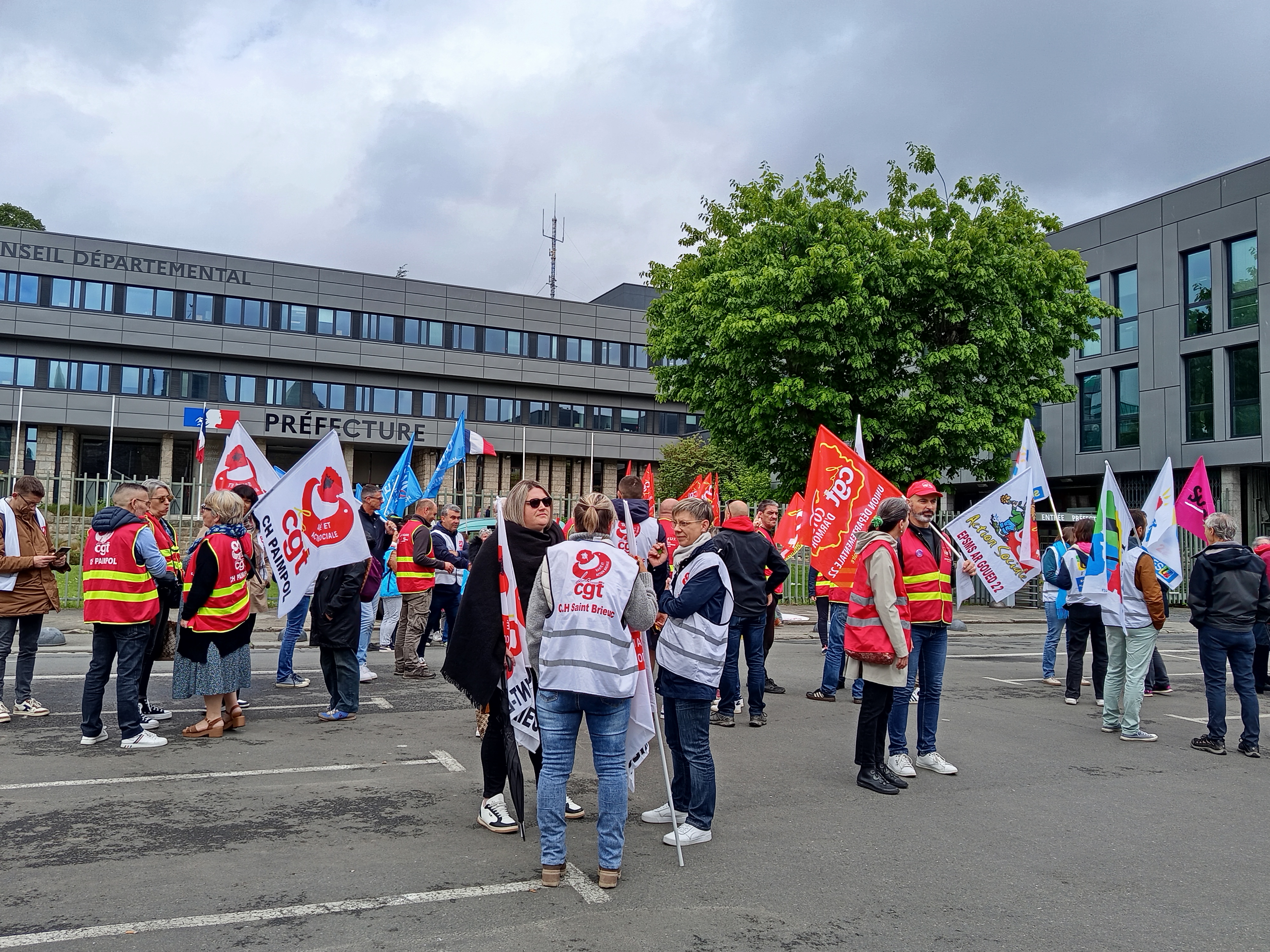 Les revendications ne manquaient pas au sein de la petite foule qui s'est formée devant la préfecture des Côtes-d'Armor, à Saint-Brieuc, mardi 13 mai dans le cadre de l’appel national à mobilisation dans les trois versants de la fonction publique. Réunis à Saint-Brieuc à l'appel de l'intersyndicale CGT, FSU, UNSA et Solidaires, des agents des hôpitaux publics, des collectivités territoriales, de l'action sociale, mais aussi des pompiers et des enseignants ont rappelé leurs inquiétudes quant à la dégradation de leurs conditions de travail. Et exigé l'annulation de la baisse de l'indemnisation des arrêts de travail et des jours de carence, la revalorisation du point d'indice et l'abrogation de la loi portant l'âge légal de départ à la retraite à 64 ans. « Le métier perd son attractivité. Les conditions de travail se dégradent, on manque de personnel partout et le salaire n'est pas mirobolant à cause du désengagement de l'État », détaille Céline Le Doré, secrétaire de l’union départementale (UD) CGT des Côtes d’Armor.
