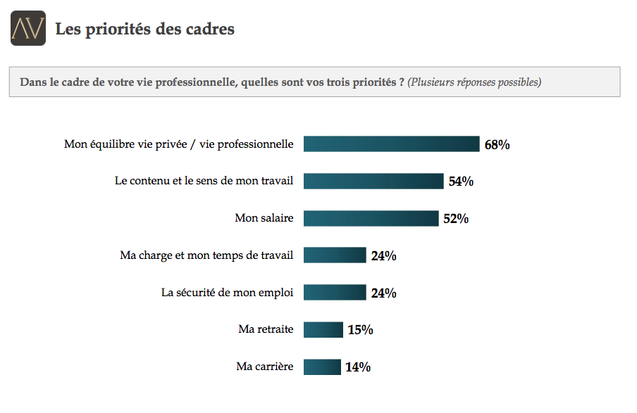 Selon le baromètre annuel UGICT-CGT / Viavoice 2016 68 % des cadres et 62 % des professions techniciennes aspirent en premier lieu à un meilleur équilibre vie personnelle-vie professionnelle. C'est la priorité numéro un pour eux, avant « Le contenu et le sens de mon travail » ou « Mon salaire »