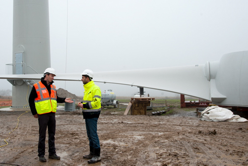 Les portières claquent. Les hommes descendent de voiture et s'avancent dans la boue. Casque de chantier vissé sur la tête, épaules rentrées pour se garder du froid, Christophe Biger salue d'une poignée de main le chef de chantier, employé par le constructeur d'éoliennes.