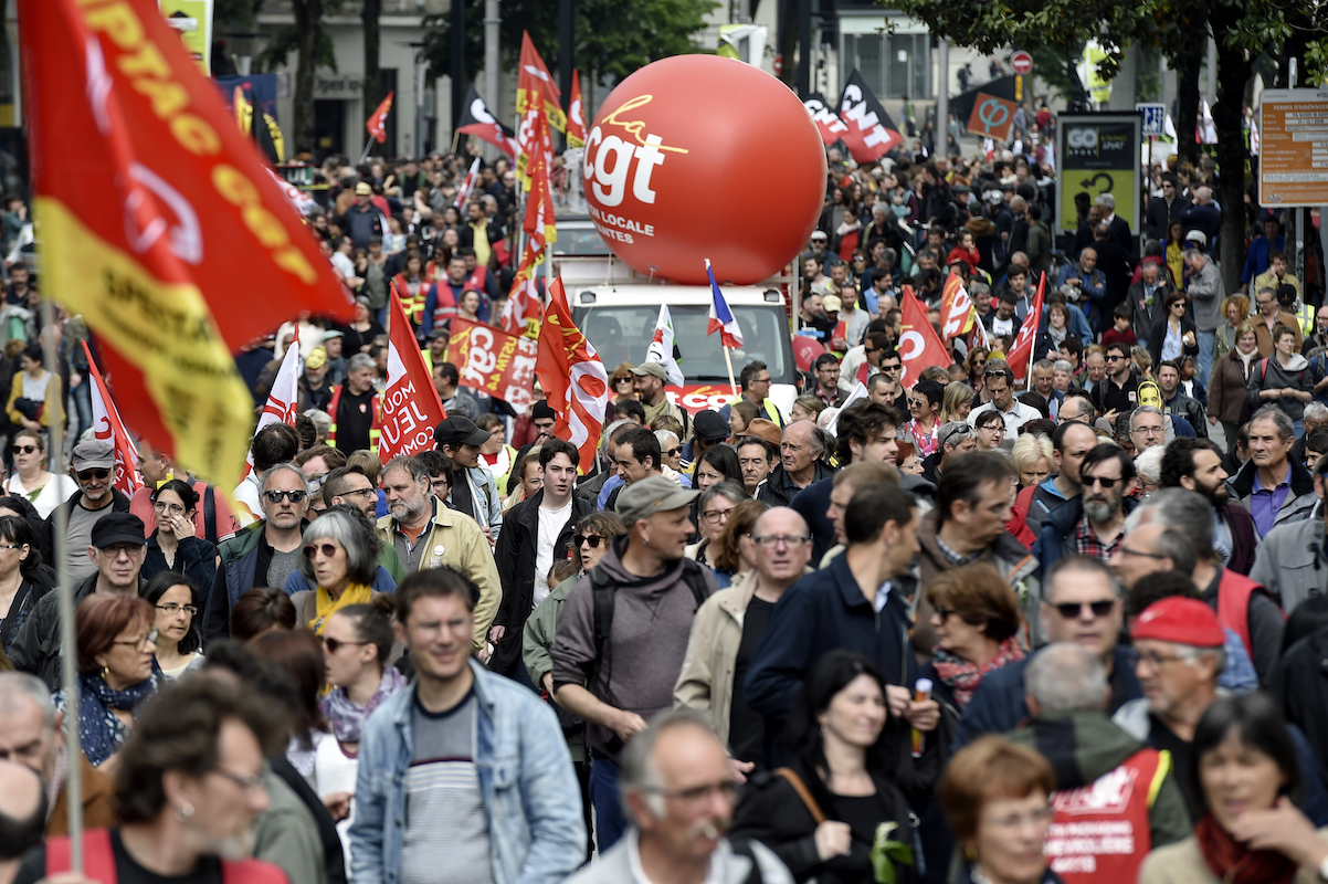 À Nantes, un cortège dense et des militants divers ont défilé pour ce 1er-mai dans une ambiance calme qui contrastait avec la répression et la désorganisation qui a mené à la fragmentation du cortège syndical parisien. Sébastien Salom-Gomis/ AFP