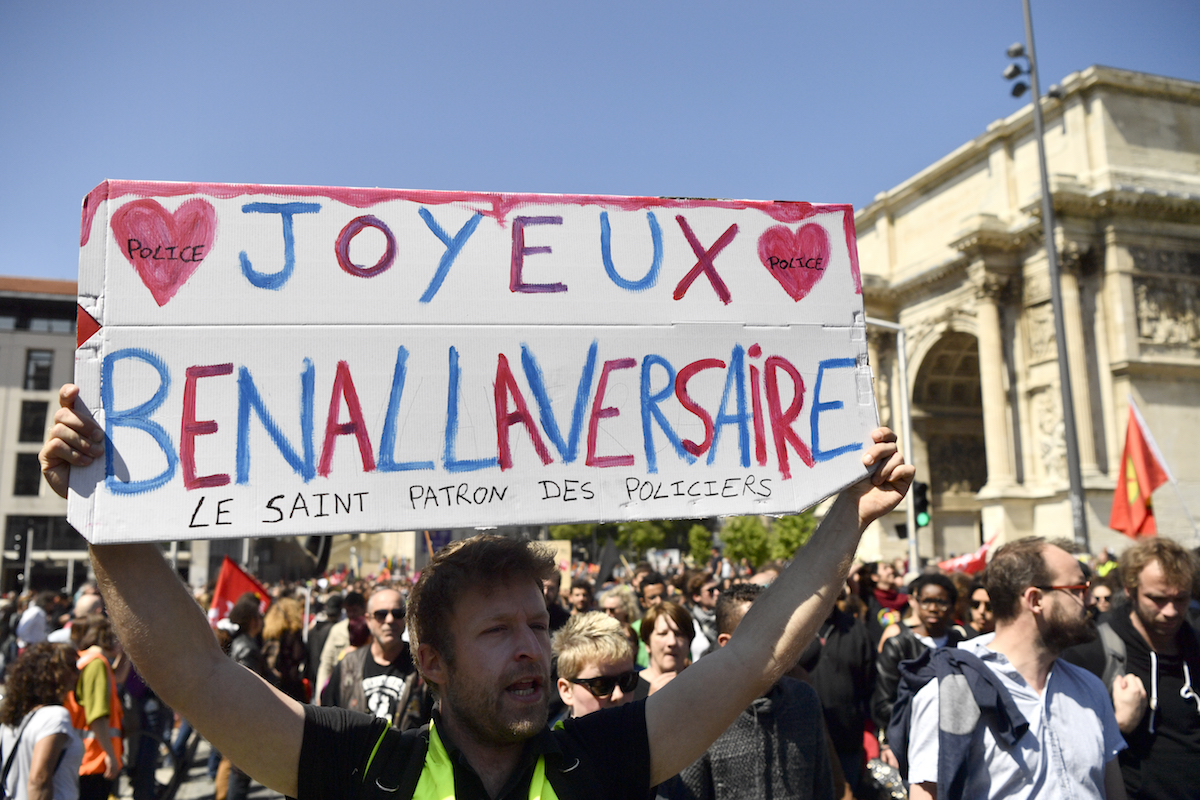 Un homme brandit une banderole qui porte le nom de l'ancien chef des aides à la sécurité présidentielle, Alexandre Benalla, lors du rassemblement du 1er mai à Marseille. L’occasion de rappeler que les événements de la place de la contrescarpe ont eu lieu il y a un an pile, lançant une affaire politique qui a démontré les failles béantes de la gestion macroniste et les viols grossiers des procédures policières et juridiques à plusieurs niveaux. Christophe Simon /AFP