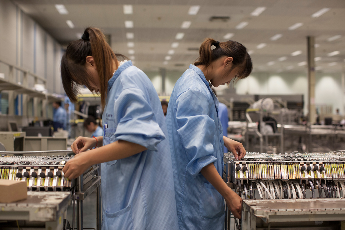 Factory workers doing quality control checks, Shanghai, China, 2012 © Olivia Arthur / Magnum Photos « Cette photo illustre à nouveau un paradoxe : la production industrielle a été obligée d’imaginer des postes de contrôle pour vérifier la qualité des produits en bout de fabrication. Mais le travail des contrôleuses est également un travail à la chaîne, dans une tâche routinière, dos à dos et qui renvoie à l’individualisation des personnels. »