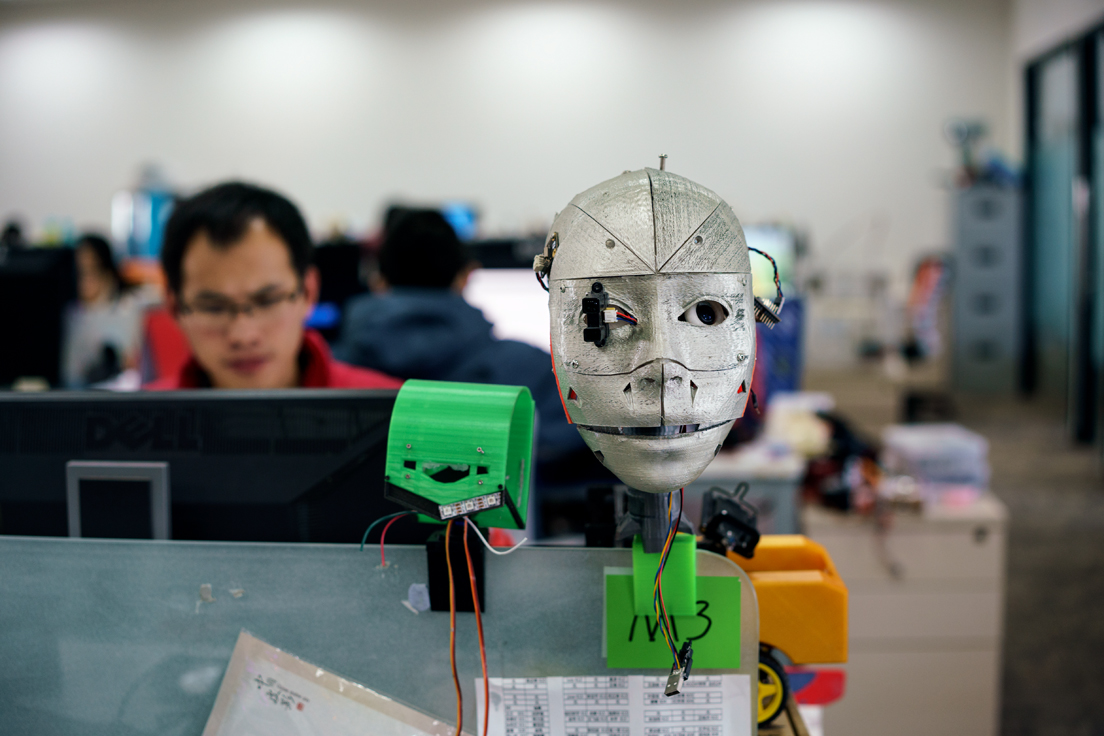 Du personnel travaillant à DF-ROBOT, une entreprise de matériel pour robots, Shanghai, China, 2015 © Jonas Bendiksen / Magnum Photos « Une forme de figure mécanique à image humaine laisse entrevoir la question de l’impact des technologies d’aujourd’hui sur le travail et la vie quotidienne. Il n’y a pas de fatalité quant aux conséquences de leur usage. Le défi sur les finalités de ces évolutions est en revanche de première importance, d’où la revendication que ces évolutions se fassent en toute transparence, en s’appuyant sur un débat démocratique qui permette aux travailleurs d’intervenir. »