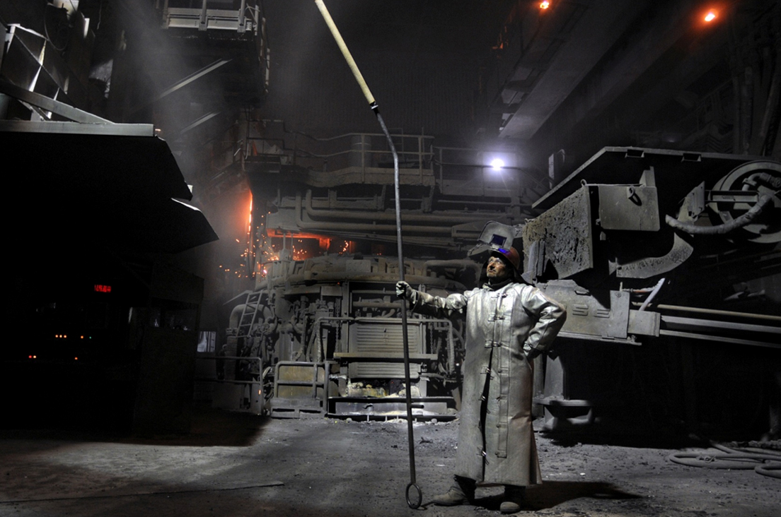 Jean-Michel, fondeur de l'aciérie de Saint-Saulve, France, 2008 © Jean-Michel Turpin « L’ouvrier fondeur a des allures de chevalier blanc au milieu de cette aciérie, un environnement de travail particulièrement pénible et usant, avec chaleur, bruits et cadences. C’est une représentation héroïque du travail, au cœur de la transformation de la matière en objets usuels. »