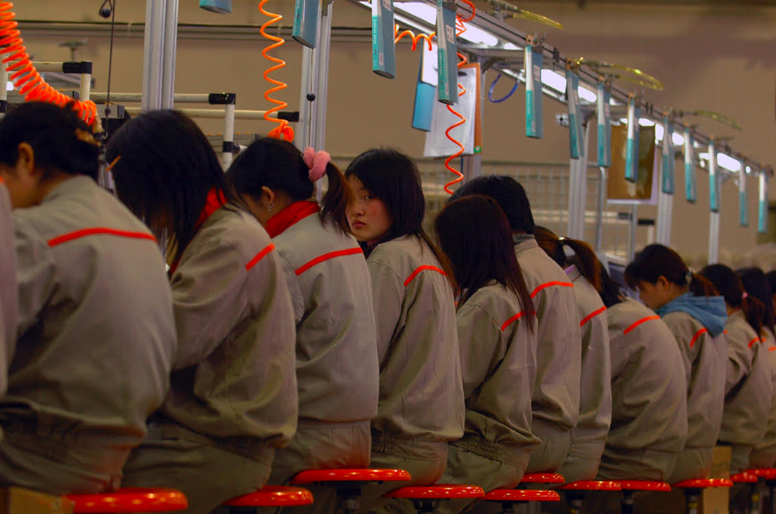 Usine d'électroménager, Shangai, Chine, 2006 © Jean-Michel Turpin « Cette photo, qui montre une rangée d’ouvrières anonymes devant une chaîne de montage, n’a une dimension humaine que parce que l’une des ouvrières a le visage tourné vers l’objectif. Ce regard empêche la photo d’exprimer une inhumanité totale. Il y a presque une forme d’interpellation. »