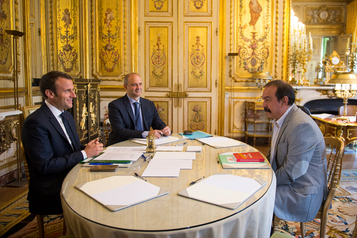 Première rencontre, le 23 mai, entre le président Macron et les organisations syndicales. Ici, la CGT, représentée par Philippe Martinez. Crédit : Éliot Blondet/POOL/REA