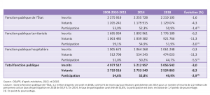 De source officielle, les premiers indicateurs de la participation font état de 2,5 millions votants sur 5,1 millions d'électeurs inscrits dans les trois versants de la fonction publique soit un.taux de 49,9% en baisse de 3,1 points par rapport au précédent scrutin en 2014. « La participation a été plus élevée dans la fonction publique territoriale (51,9 %) que dans la fonction publique de l'État (50,9 %) et plus faible dans la fonction publique hospitalière (44,7 %) » , indique le site fonction-publique.gouv.fr qui précise que « les résultats par organisation professionnelle seront centralisés et diffusés pour l'ensemble de la fonction publique le 11 décembre » .