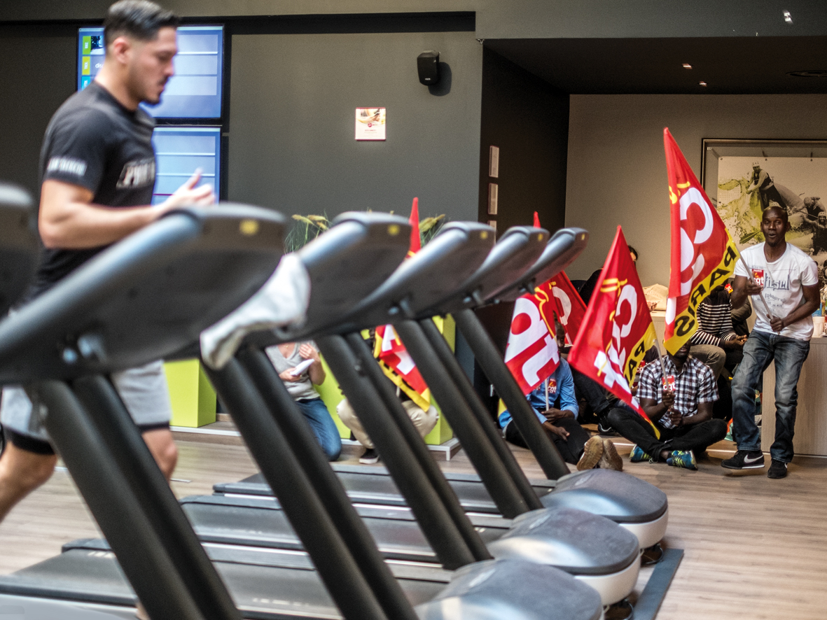 Occupation de la salle de sport "keep cool" du 22 rue de Chateaudun à Paris par les salariés de la sous traitance du nettoyage, la société BSL, le 15 octobre 2018.