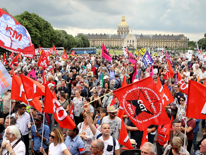 Alors qu'à quelques centaines de mètres de là, les nouveaux députés et nouvelles députées prenaient place pour la première fois à l'Assemblée, près de 1 100 manifestants se sont rassemblés sur l'esplanade des Invalides à Paris, à l'appel des syndicats CGT-FO-Solidaires-Unef-FSU, pour rappeler leur opposition à certaines réformes annoncées de ce début de quinquennat.