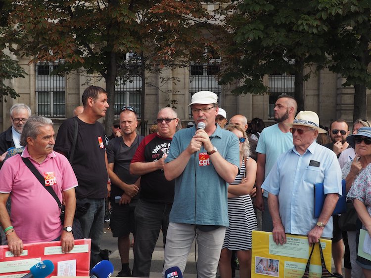 Avant la publication le 6 août de nouveaux relevés mesurant la contamination au plomb autour de la cathédrale Notre-Dame de Paris, syndicalistes CGT et membres d’associations, récemment constitués en collectif, se sont rassemblés pour exiger des mesures de protection des salariés du chantier et des populations impactées par les fumées toxiques.