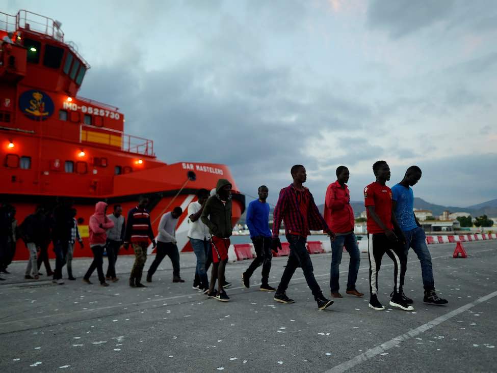 Migrants, intercepted off the coast in the Mediterranean Sea, walk as they leave a rescue boat after arriving at the port of Motril, southern Spain October 2, 2018. REUTERS/Juan Medina - RC16130A8FF0