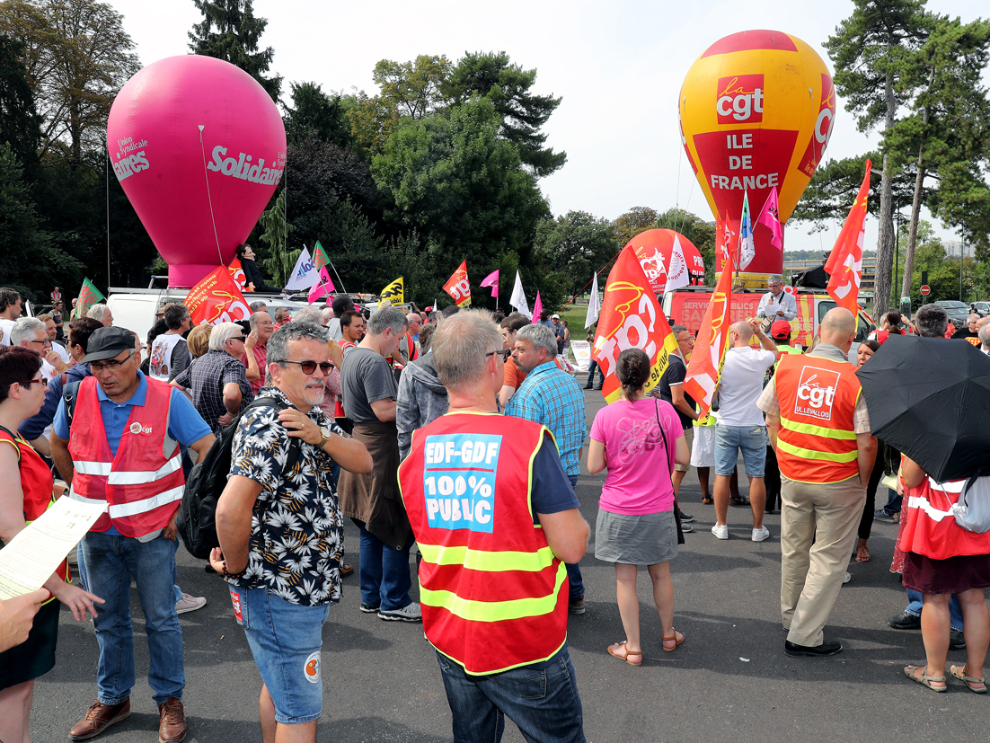 Rassemblement à l'appel de la CGT et de Solidaires Ile de France près de l'hippodrome de Longchamps où se déroulent les universités d'été du MEDEF.